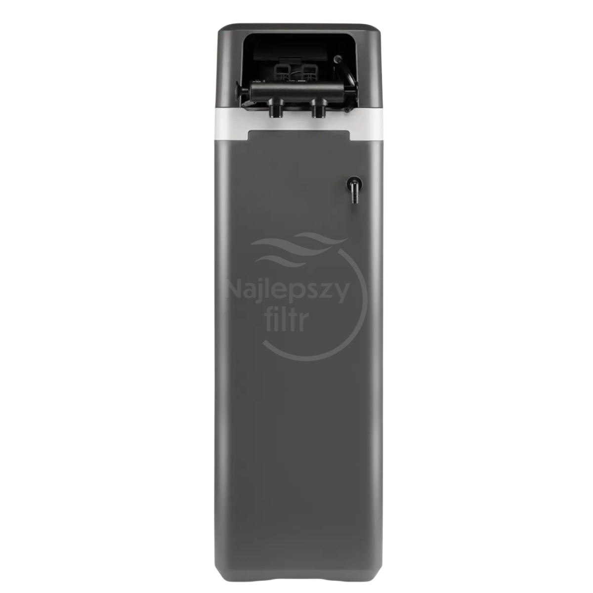 Zbiornik ciśnieniowy oraz zbiornik solanki zostały zintegrowane w jednej obudowie typu Cabinet, co ułatwia montaż w pomieszczeniu technicznym, kotłowni lub pralni.